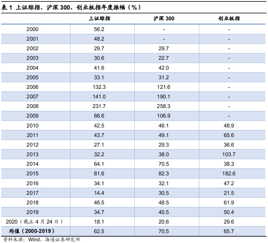以年度视角看,市场振幅最终有望向上拓宽。统计A股主要股票指数2000年至2019年的年均振幅,其中上证综指2000年以来年振幅大部分时间在25%-45%之间,只有在大牛市或熊市的时候振幅会上升到80%以上,年平均振幅为62.5%,2017年振幅最小,仅14.4%,但这一年市场结构性特征明显,上证50为代表的价值股全年涨幅25.1%,而创业板指为代表的成长股全年下跌-10.7%。而今年(截至4/24)上证综指振幅只有18.1%,还不及近过去20年年均振幅的1/3。沪深300指数2002年设立以来年振幅大部分时间在30%-50%之间,平均振幅为70.5%,2003年振幅最小22.7%,而今年振幅20.6%;创业板指2010年设立以来年振幅大部分时间在35%-65%之间,平均振幅为65.7%,今年振幅29.6%。