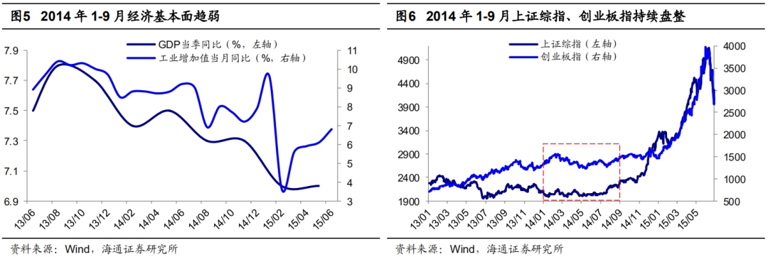 从市场风格看,2013年开始股市结构性特征明显,创业板指为代表的成长股持续上行,一直到 2014年2月涨幅达106.3%,随后14年2月-6月下跌盘整,最大跌幅20.4%。这一时期上证综指在1974-2177点窄幅盘整,市场整体萎靡且无结构性机会。当下也是类似,2019年以来创业板指为代表的成长股再次占优,一直到 2020年2月涨幅达82.9%,但3月以来近期创业板也相对低迷,在1800-2000点持续震荡。