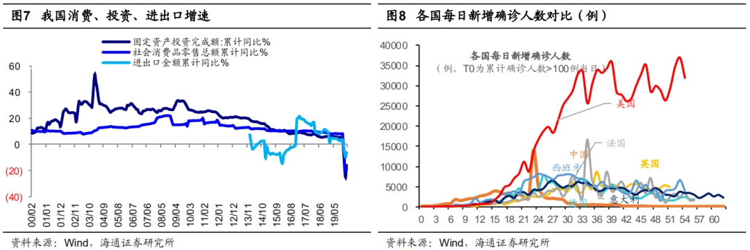截止4月25日,全球(除中国)累计确诊人数共计283万例,美国当前新增确诊人数/前期新增确诊人数高点为31994例/37007例,英国为4929例/8720例,法国为1665例/16531例,德国为1835例/7839例,确诊人数最多的美国目前仍处于高位盘整期,未看到明确拐点,未来还需要进一步跟踪确认。如果海外疫情持续时间较长,外需对经济增长的拖累将凸显,尤其是全球产业链如被疫情中断,国内的生产也会受到影响。只有海外疫情得到控制,出现拐点,国内政策效果才能体现。二季度后半段是个重要观察和确认窗口,目前Wind一致预期2020年中国GDP增速3.4%,如果美欧疫情确认得到控制,下半年外需压力缓解,国内GDP增速及企业盈利预期存在上修的可能。
