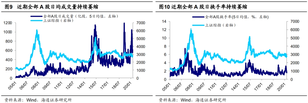 从换手率看,最近5日全部A股换手率为1.1%左右,而2018/10/19上证综指低点前后为0.6%左右,2019/01/04上证综指低点前后为0.5-0.6%,2019/08/06上证综指低点前后为0.6%左右,2019/12/03上证综指低点前后为0.6%左右,目前换手率未达到过去两年阶段性低点时期的水平。从融资交易占比看,最近5日全部A股融资交易占比为8.8%,而2018/10/19上证综指低点前后为6.6%,2019/01/04上证综指低点前后为5.9%,2019/08/06上证综指低点前后为6.3%,2019/12/03上证综指低点前后为7.3%,目前A股融资交易占比还未达到过去两年阶段性低点时期的水平。