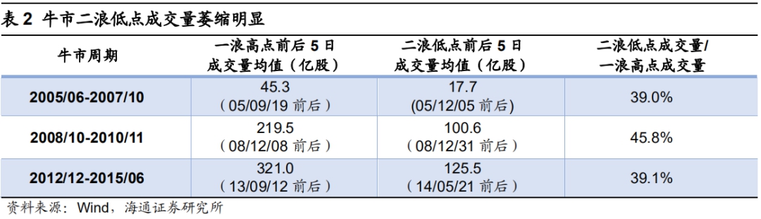 等市场情绪指标降到低点后物极必反。经济数据是宏观基本面的度量指标,市场情绪则是股市最直接的反应,以周期轮回来理解以成交量为代表的市场情绪,借鉴历史上三轮牛市经验,当2浪末期全部A股成交量萎缩至1浪高点的40%左右时,市场情绪悲观到极致,此后往往峰回路转,市场进入新一轮上升期,迎来牛市3浪阶段。同样以05-07年牛市为例说明,在05/09/19前后1浪高点成交量均值为45.3亿股,而在05/12/05前后2浪低点降至17.7亿股,2浪低点成交量萎缩至1浪高点的39%。而08-10年牛市2浪低点成交量萎缩至1浪高点的46%;12-15年牛市中,以上证综指刻画,牛市2浪低点成交量萎缩至1浪高点的39%。
