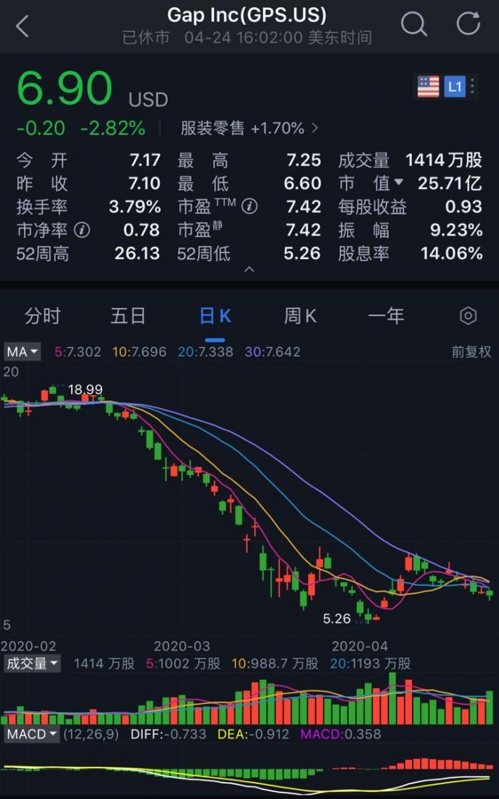 这次疫情也导致了GAP的股价今年已经下跌60%,市值蒸发约有40亿美元(约合人民币283.25亿元)。