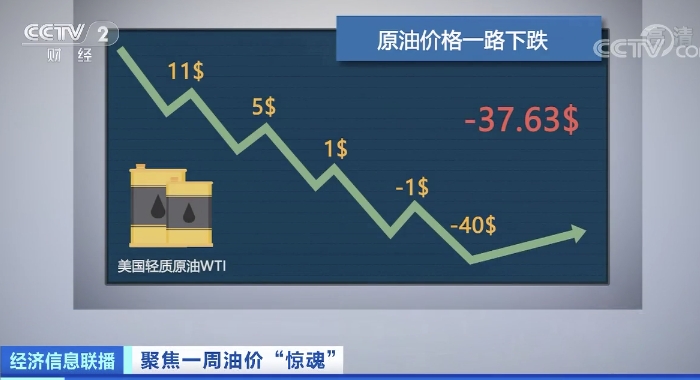但短暂上涨之后,原油价格出现“坍塌”。从4月19日晚开始,美国轻质原油WTI 5月合约价格一路下跌,不断突破人们的认知极限,11美元、5美元、1美元、-1美元、-40美元……最终在收盘时跌至-37.63美元/桶,跌幅超过300%, “倒贴钱”原油期货问世。