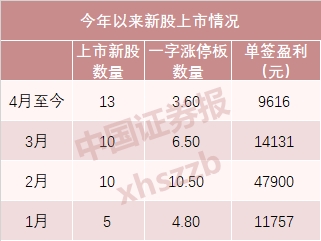 4月至今,两市共有13只非科创板新股上市,其中10只已开板新股平均收获了3.6个一字涨停板,平均单签盈利仅9616元。与此前相比,打新收益下降明显。