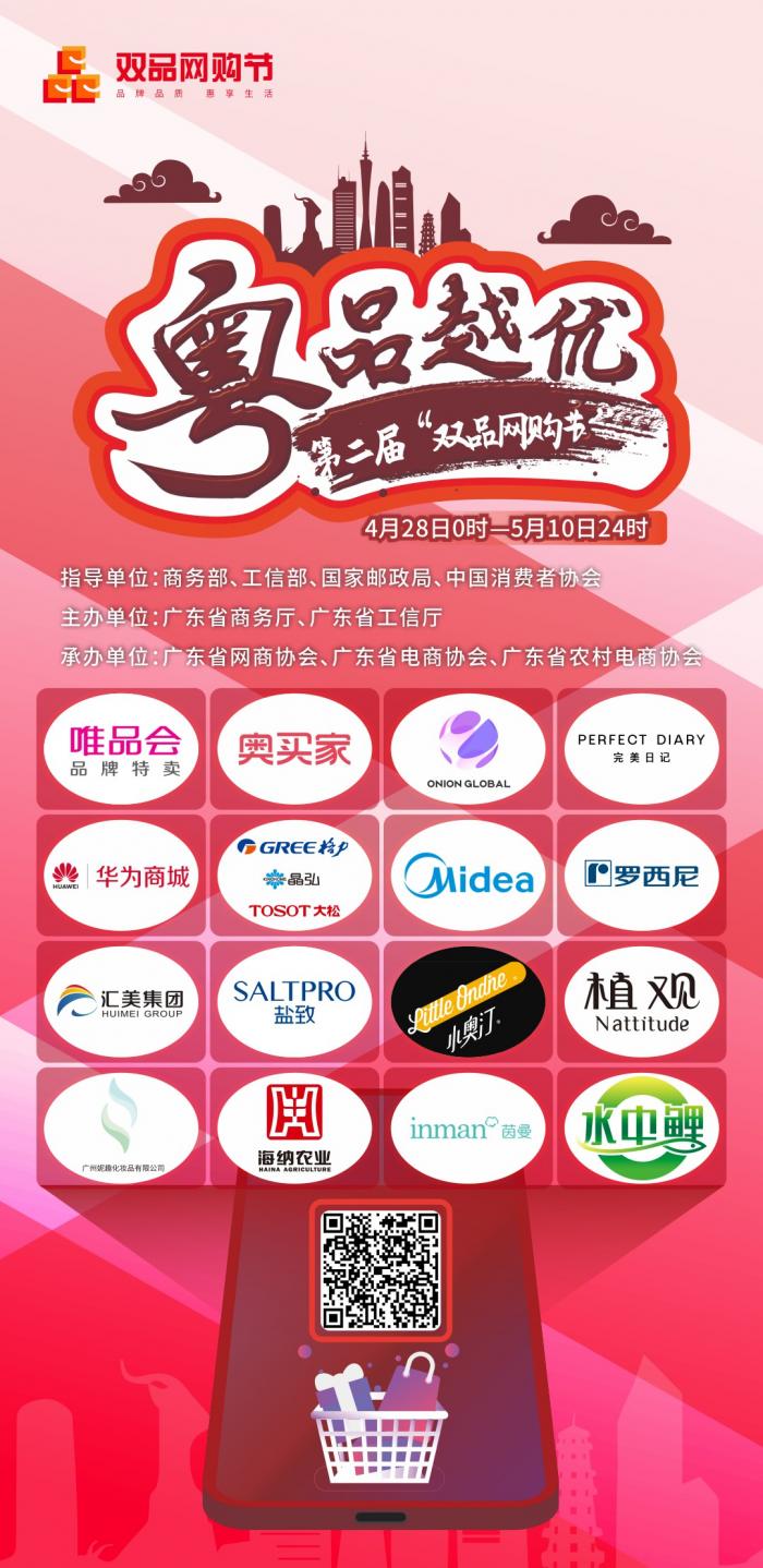 “粤”大范围:本次活动全国参与电商企业超百家,广东重点推荐企业12家,覆盖生产端和平台端,涉及食品、化妆品、空调、手机、服装等多个品类。既有唯品会、洋葱、奥买家等大型电商平台,也有华为、格力、美的等智能制造企业,以及完美日记、广东盐业、茵曼女装、罗西尼表业、海纳农业、植观洗护等优质消费品牌,满足消费者不同需求。
