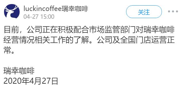 瑞幸咖啡回应称,目前公司正在积极配合市场监管部门对瑞幸咖啡经营情况相关工作的了解,公司及全国门店运营正常。