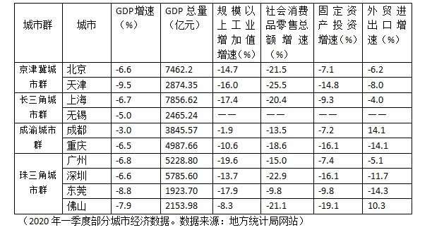 以城市群为维度,国内四大城市群——京津冀、长三角、珠三角、成渝城市群中的主要城市,已经分别公布了主要经济数据。