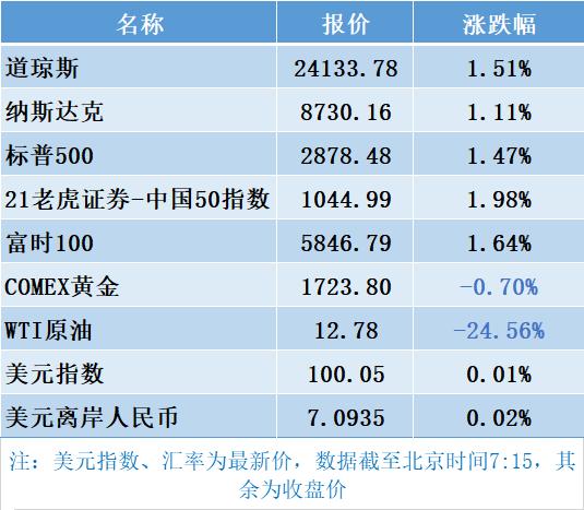 2、美联储重启经济预期及超预期企业财报提振市场情绪,从而减弱原油期货暴跌令市场的恐慌,美股高开高走全线收涨,道指涨逾350点;邮轮股及新能源汽车股飙升,特斯拉工厂复工预期提振收盘大涨逾10%,蔚来汽车大涨近10%。