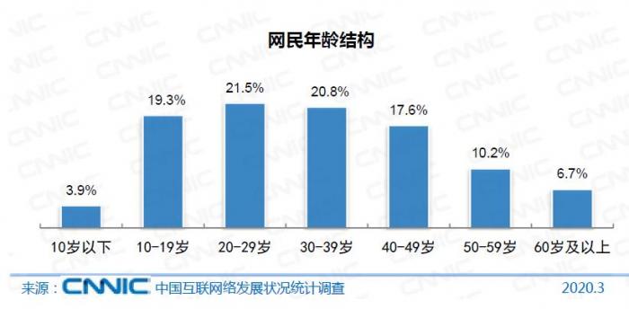 20-29岁网民占比21.5%,30-39岁占比20.8%。同时,持续向中高年龄群体渗透。