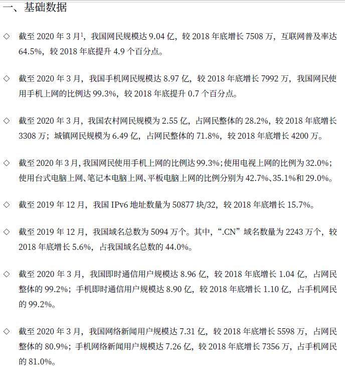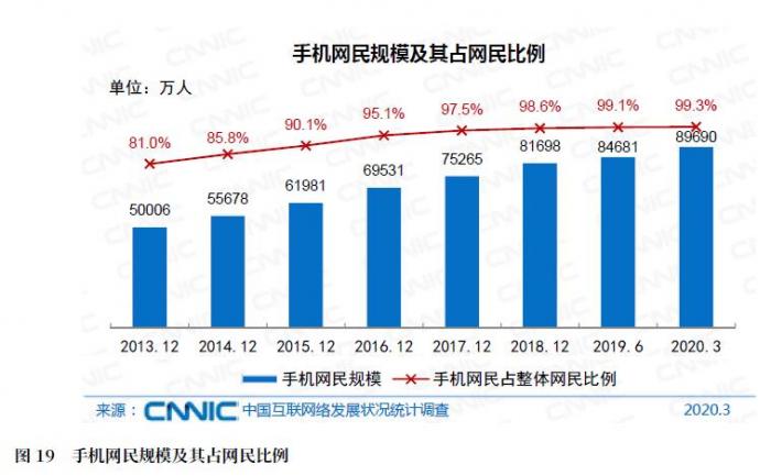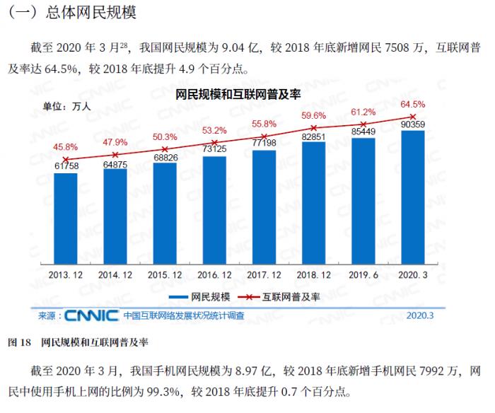 4月28日,中国互联网络信息中心(CNNIC)发布第45次《中国互联网络发展状况统计报告》。《报告》显示,截至2020年3月,我国网民规模为9.04亿,互联网普及率达64.5%;手机网民规模达8.97亿,占比总体网民数量的99.3%。