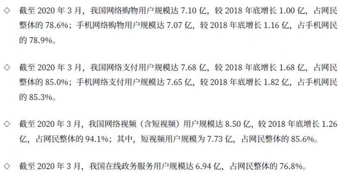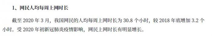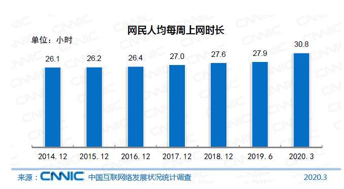 《报告》显示,截至2020年3月,中国网民的人均每周上网时长为30.8个小时,较2018年底增加3.2个小时。受2020年初新冠肺炎疫情影响,网民上网时长有明显增长。