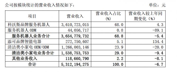 4月27日晚间,家用服务机器人龙头科沃斯(603486.SH)发布2019年年报:实现营业收入53.12亿元,较2018年下降6.7%,净利润1.21亿元,较2018年下降75.12%。