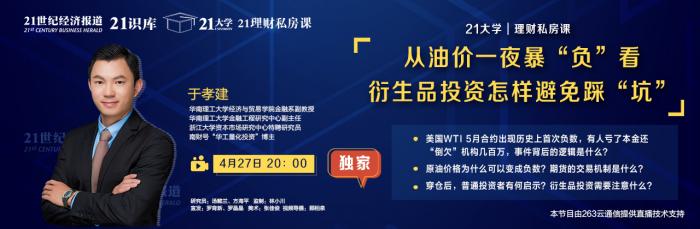 4月27日,华南理工大学经济与贸易学院金融系副教授,金融工程研究中心副主任,浙江大学资本市场研究中心特聘研究员于孝建做客21大学第37期“理财私房课”节目,就《从油价一夜暴“负”看衍生品投资怎样避免踩“坑”》进行主题深度剖析。近日,WTI原油5月官方结算价跌至负37.63美元每桶,紧接着带出的中行原油宝事件引起市场轰动。于孝建给出了原油价格为什么能变成负数的原因,并为投资者合理投资衍生品提供了建议。