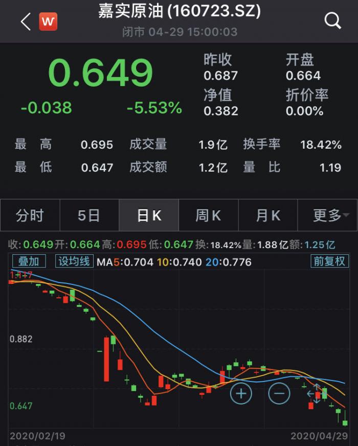 仅隔一天之后,4月29日,易方达原油基金再次发布溢价风险提示公告称,2020年4月24日,该基金在二级市场的收盘价为0.760元,相对于当日0.3725元的基金份额净值,溢价幅度达到104.03%。