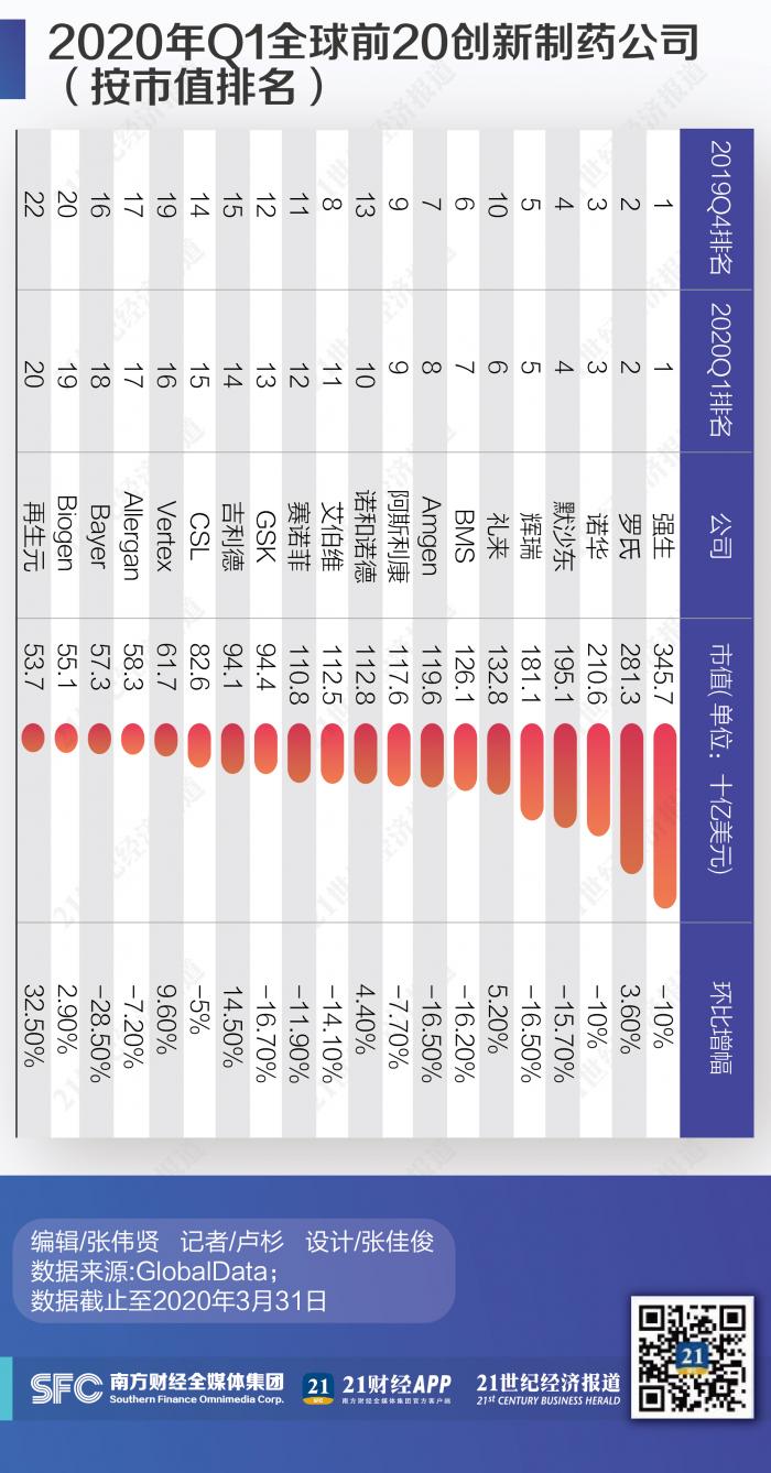 强生继续保持头把交椅,尽管其市值季度环比下降10%。GlobalData药品和商业基础知识高级总监Peter Shapiro评论说,“由于这些公司的长期增长,这些逆转似乎是戏剧性的;但是与其他行业相比,COVID-19疫情对制药业的影响很小。”