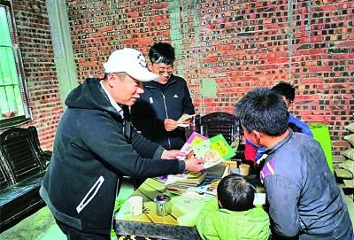 董晓光(左一)在给孩子们赠书。资料图片
