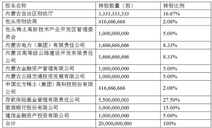 公告称,蒙商银行系一家城市商业银行,注册资本为人民币200亿元,股份总额为200亿股,股东及其持股数量、持股比例如下: