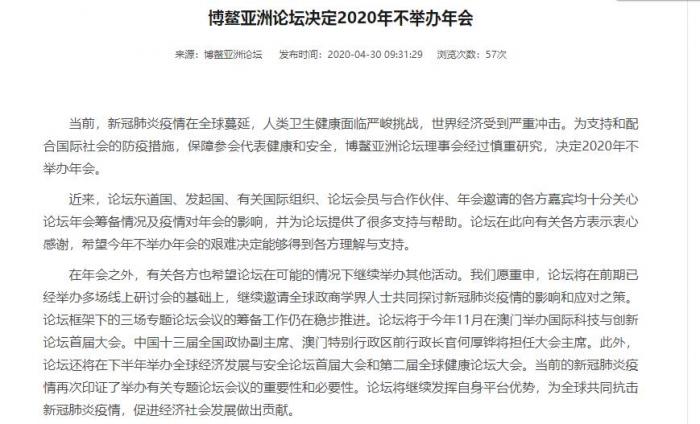 4月30日博鳌亚洲论坛官网消息,博鳌亚洲论坛决定2020年不举办年会。