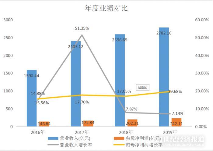 2019年财报显示,美的集团实现营业收入2782.16亿元,同比增长7.14%;实现归母净利润242.11亿元,相比同期增长19.68%;扣非净利润为227.24亿元,同比增长13.29%。从营收增速走势图来看,营收增速基本与2018年一致,同时归母净利润增速也保持着稳定的增长,总体业绩表现较为平稳。