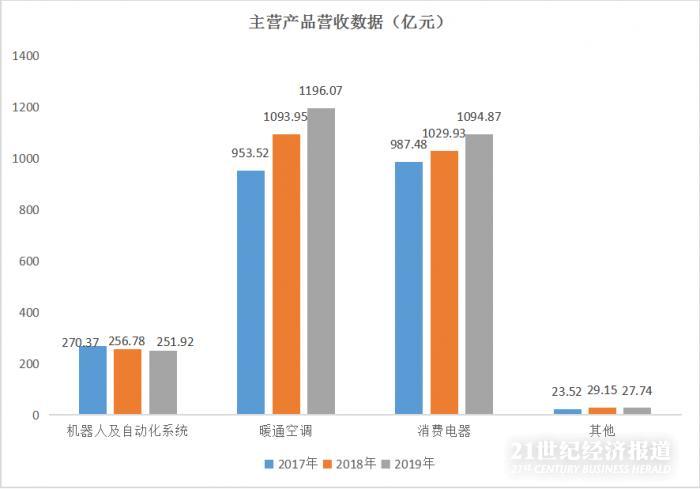 从主营产品的营收数据上看,暖通空调及消费电器是美的集团营收的主要来源。2019年暖通空调产品实现营收1196.07亿元,同比增长9.33%,而消费电器产品实现营收1094.87亿元,同比增长6.31%,两项产品营收占比达到总体营收的89.12%。在2019年家电行业不景气的情况下,美的集团两大主营产品营收的稳定增长,保证了总体营收的稳定。