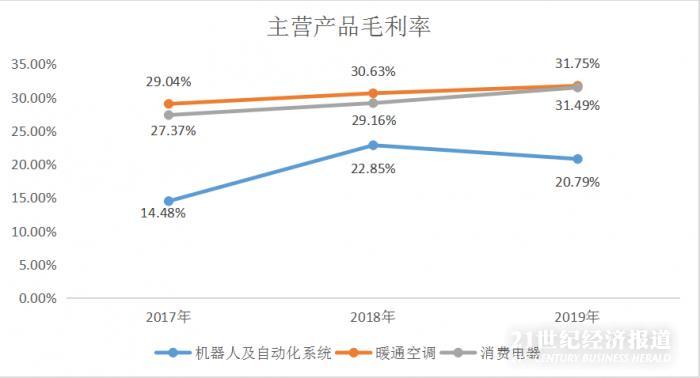 库卡集团2019年财报显示,库卡集团在2019年度实现营业额31.926亿欧元,同比2018年的32.421亿欧元下滑了1.5%。从美的集团的财报上看。以库卡集团作为核心的美的集团机器人及自动化系统业务,营收连续的下滑,2019年该业务营收为251.92亿元,同比减少1.89%。毛利为20.79%,较2018年22.85%的毛利下滑了大致两个百分点。