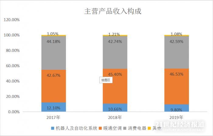 库卡集团是美的集团机器人及自动化系统业务的最主要收入来源。2017年,美的集团为了实现对库卡集团的绝对控股,以292亿元、溢价36.2%的代价完成了对公司的收购。但被寄予厚望的库卡集团在被收购后业绩表现却不理想。从主营产品的营收结构上看,美的集团机器人及自动化系统业务的营收占比是在逐年下降的。