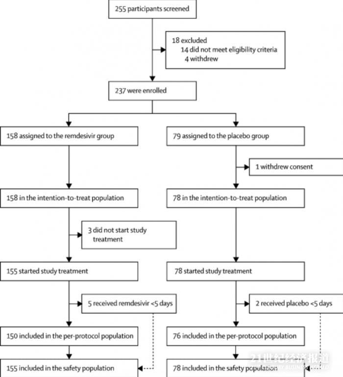 在2020年2月6日至2020年3月12日之间,筛选了255位患者,其中237位符合条件入组。158例患者接受了瑞德西韦治疗,79例接受了安慰剂治疗。安慰剂组中的一名患者在随机分组后撤回了先前书面知情同意书,因此意向治疗患者群(ITT)中包括158名和78名患者。