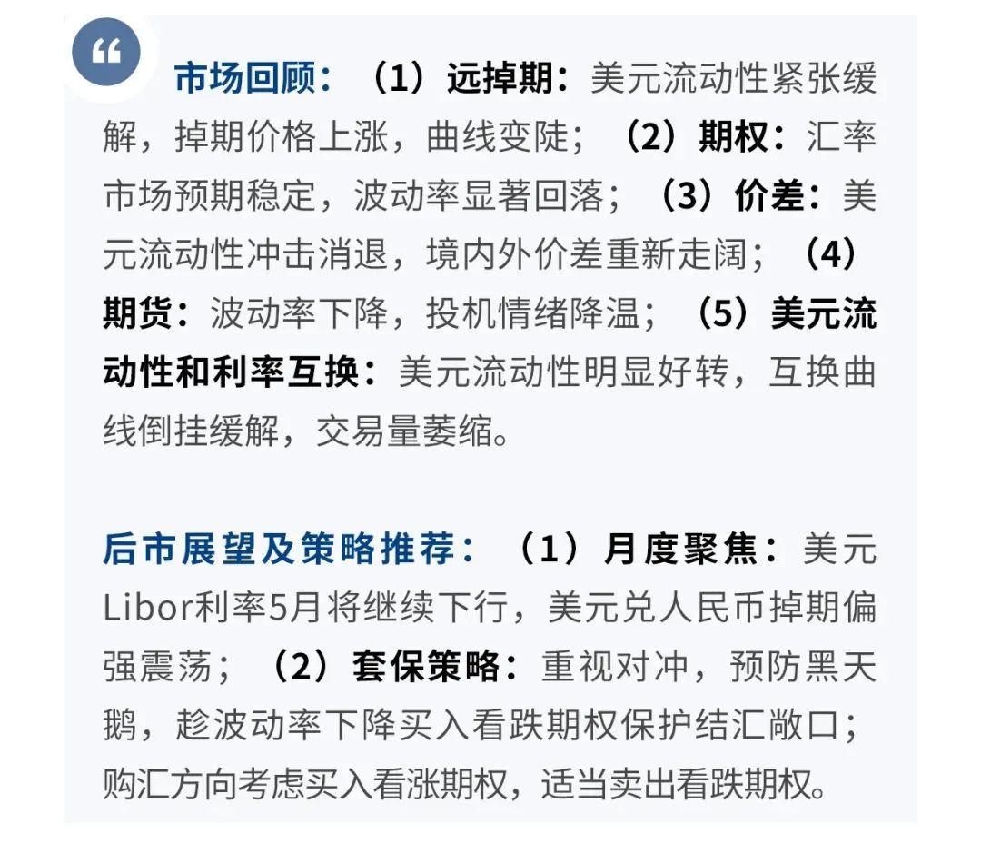 央行副行长陈雨露近期在国新办发布会会上表示“预计人民币对美元汇率在7附近上下波动,有贬有升,继续双向浮动,外汇市场运行平稳,汇率预期稳定”。尽管4月市场风险偏好回升,波动率下降,但不应忘记在当前的经济和市场环境下,市场波动只是暂时消退,年内发生“肥尾风险”和黑天额事件的概率依旧很大,对于有外币业务和敞口的企业一定要做好必要的对冲。对于结汇需求的企业,可以考虑在5月掉期走高的情况下,通过远期进行部分结汇,也可以在期权波动率进一步下降的情况下买入看跌期权。对于有购汇需求的企业,在当前的环境下尤其要重视汇率对冲,不过当前远掉期价格的吸引力有限,趁5、6月波动率下降的窗口买入看涨期权——实值或者虚值皆可,适当卖出看跌期权进行补贴,对于卖出(虚值)看涨期权则需谨慎。