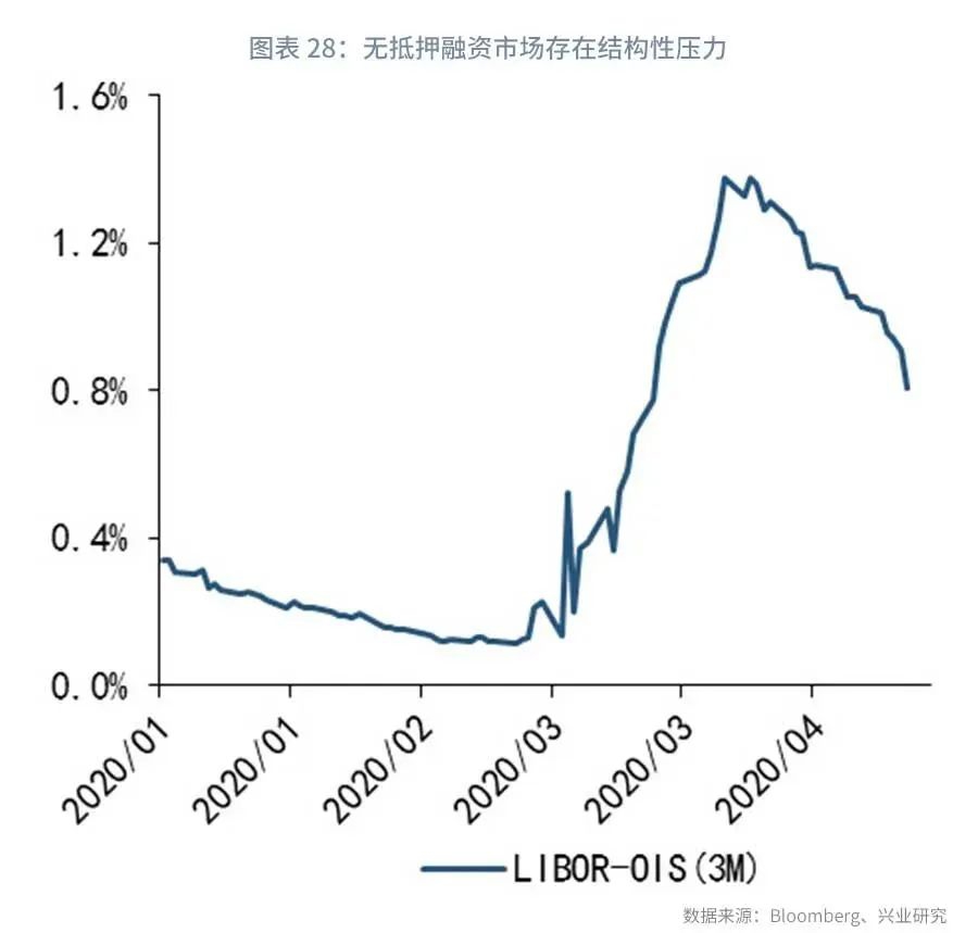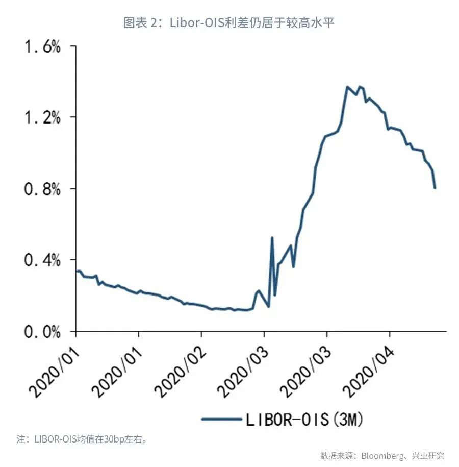 市场不活跃是造成利率调整迟缓的重要诱因。另一方面,尽管美联储在3月17日推出商业票据融资便利工具(CPFF),但是由于该工具落地较晚(4月14日)、定价较高(评级为A1/P1/F1的高评级企业商票购买利率为OIS利率+110bp,如果考虑一级交易商的交易费用和利润,利率定价可能会更高),其对于美元商票市场的支持力度相较其他工具有限,这也导致Libor-OIS利差收敛缓慢。