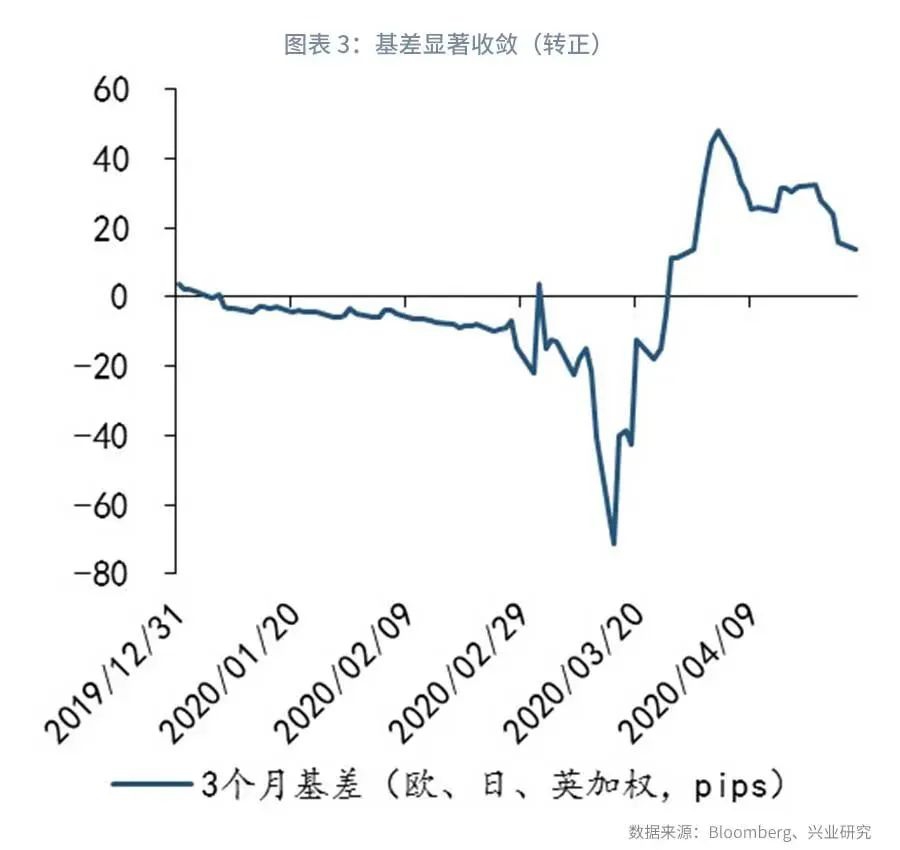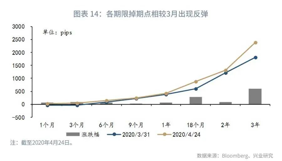 4月,各期限人民币掉期均出现企稳反弹,长端上涨更加明显,掉期曲线斜率趋于陡峭。中美利差扩大以及境内美元流动性冲击缓解均是掉期价格显著上涨的重要支撑因素。利差方面,人民银行在月初降准后暂停逆回购操作,并缩量续作MLF和TMLF,3个月Shibor利率止住跌势,股份制银行NCD发行利率出现小幅反弹,不过银行间市场流动性保持充裕,短端回购利率依旧保持在低位。美元Libor(3个月)在美联储连续加码宽松下出现明显回落。基差方面,美元兑在岸人民币基差明显收敛,反映了境内美元流动性紧张情况已经大幅缓解,进一步助力掉期价格上涨。除此之外,在跨境资本流动方面,经历了3月净流出之后,4月风险偏好的回升使得资金重回境内,这是掉期价格上涨的重要中观因素。