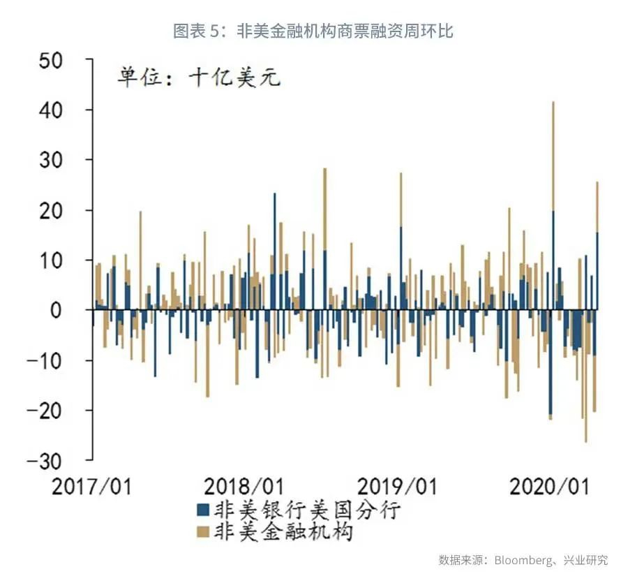 Libor利率反应迟缓,尚未完全反映离岸美元流动性的改善。尽管3个月美元Libor利率4月明显下行,但市场关心的Libor-OIS利差仍远高于历史均值。不过,如果我们从主要非美货币的基差来看,离岸美元流动性的冲击已大幅缓解,甚至已经出现了过剩的迹象。我们倾向于认为由于结构性的因素,Libor利率尚不能完全反映当前离岸美元流动性的改善情况:一方面,我们在上一期中说明Libor利率与AA级金融企业发行美元商业票据的利率息息相关,其中非美金融企业(包括海外机构的美国分支)发行量占据重要地位。3月以来,金融市场动荡、信用风险上升导致非美金融机构的商票融资明显下降,持续出现“入不敷出”的负融资情况(见图表 4和图表 5)。美联储在3月26日之后便不再公布AA级金融商业票据的发行利率,原因主要在于交易数据不足。