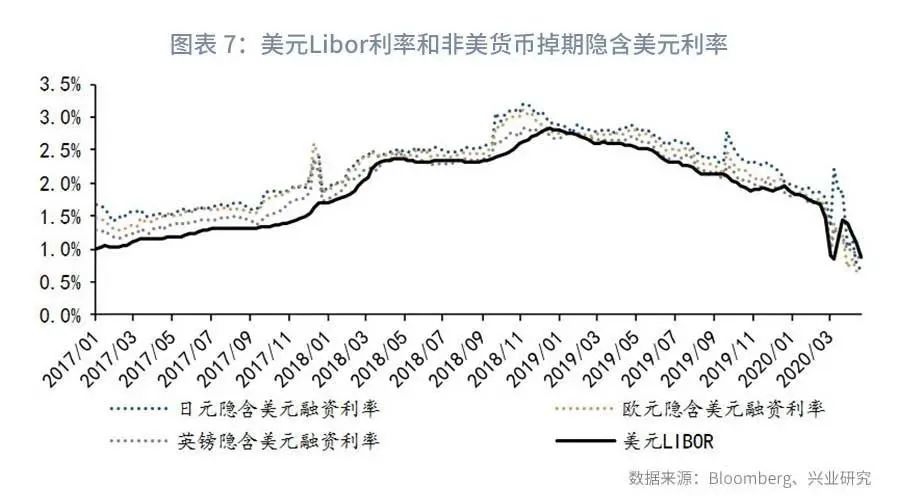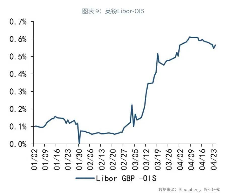 离岸美元市场将助力Libor利率继续下行。尽管美元商业票据市场表现惨淡,但在美联储互换额度和临时回购便利的“呵护”下,欧、日、英等发达经济体的外汇掉期市场的美元供给相对充裕,相对美元的基差转正。这意味着有美元融资需求的企业进行“跨境美元融资操作”的成本相较于直接进行美元融资会更低。跨境美元融资操作指的是企业通过欧元、英镑等非美货币市场融资+卖出美元掉期来获得美元资金。由于套利机制的存在,从历史上看美元Libor利率一般会低于上述跨境操作的隐含美元利率,但是近期结构性因素使得该利率异常高于非美货币的“隐含上限”(见图表 7)。不过融资套利已经在逐步发挥作用,我们从欧元和英镑货币市场利率的表现可见一斑——在欧央行和英央行大放水的情况下,两者Libor-OIS的利差反而在4月居高不下。预计5月美元Libor利率在融资套利因素的影响下会回落至“隐含上限”以下——0.6%甚至更低,此外欧日英等非美货币的基差可能逐步由正转负。