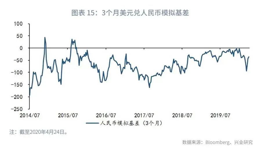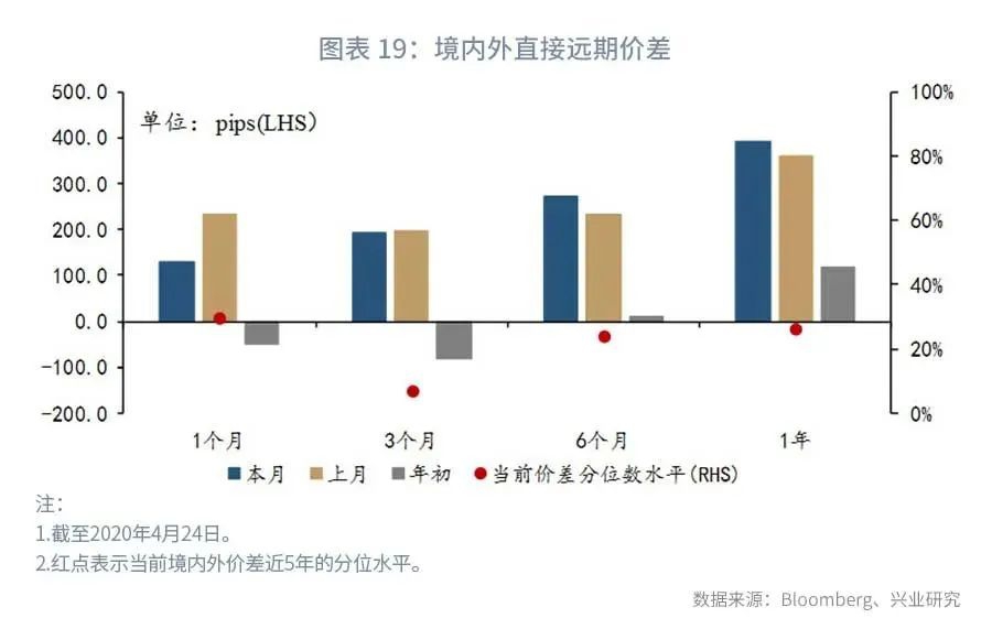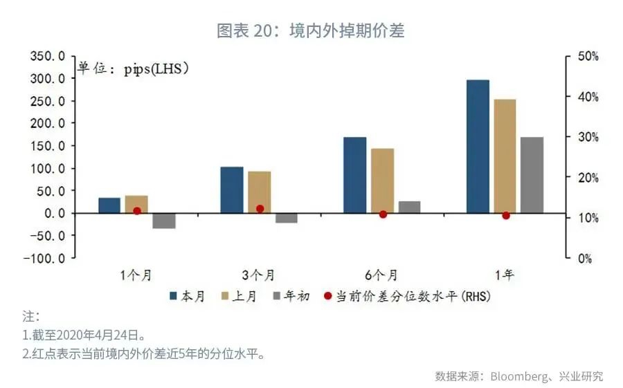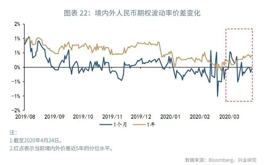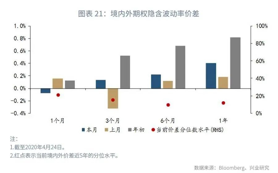 4月,境内外远掉期价差(境外减去境内)相较3月末整体上走阔,美元流动性冲击的缓解对于离岸市场的影响更加明显,不过由于近期远掉市场波动较大,从3、4月中枢来看,境内外价差水平大致相当(见图表12和图表13)。期权方面,3月境内期权波动率的异常上涨在4月逐渐消退,境内外波动率价差走阔,不过1月波动价差的起伏依旧较大,所以导致4月末处于负值水平,但是从变化趋势来看依旧是逐步走阔(见图表14)。