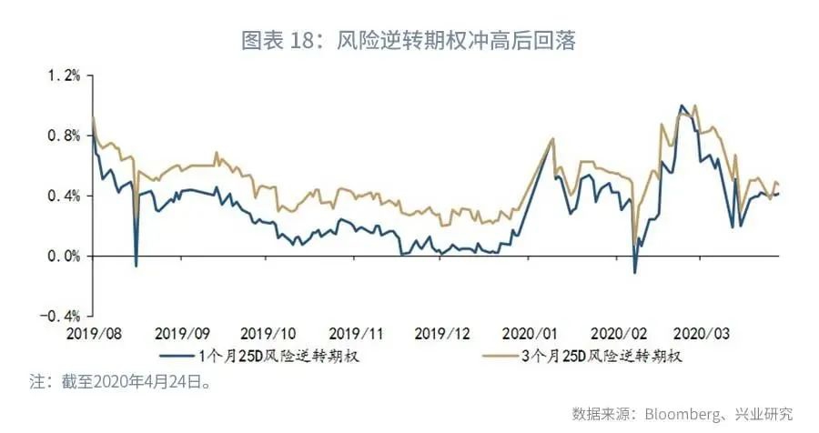 4月,全球疫情蔓延在整体上逐步得到控制,叠加美元流动性紧张情况缓解,各期限人民币期权隐含波动率均出现下行,其中短端下行尤其明显,波动曲线显著平坦化——1年期和1个月期限溢价收窄至约0.1%的水平,暗示疫情和金融市场动荡对于人民币汇率的冲击阶段性消退。4月人民币汇率实际波动率也显著回落,其中短端回落更加明显,波动率风险溢价也随之收敛,虽然1周期限依旧偏高,不过其他期限保持稳定,预计短端风险溢价5月会进一步下行(见图表 9、图表 10);25Delta的风险逆转期权波动率显著回落,中国人民银行副行长陈雨露3月22日在国新办发布会上表示“总体上,预计人民币对美元汇率在7附近上下波动,有贬有升,继续双向浮动,外汇市场运行平稳,汇率预期稳定”[2]。