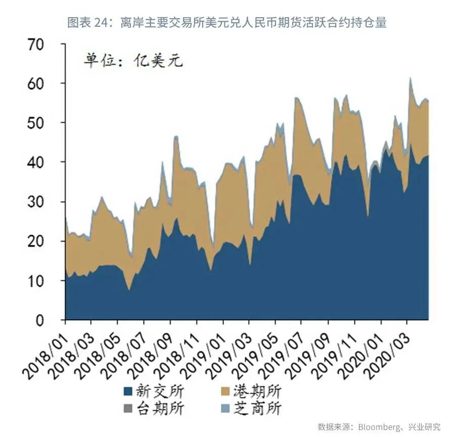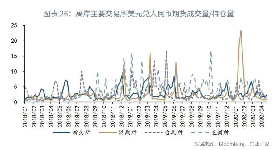 4月,离岸美元兑人民币期货价格先跌后涨,但波动幅度有限,月初离岸美元流动性紧缺情况缓解,人民币期货价格下跌(人民币升值),不过尽管中美货币市场利差再度走阔,但市场预期人民银行还有进一步宽松的空间,期货价格上涨有限,全月来看大部分美元兑人民币期货合约价格收跌,芝商所合约意外上涨,主要在于3月末受市场波动影响合约价格相对较低(见图表16)。4月人民币汇率波动率明显下降,这导致人民币期货持仓量和交易量均出现下降,整体投机情绪降温。(见图表17、图表18和图表19)。