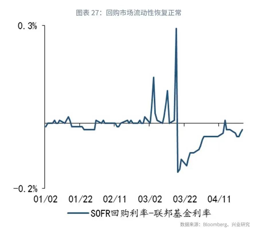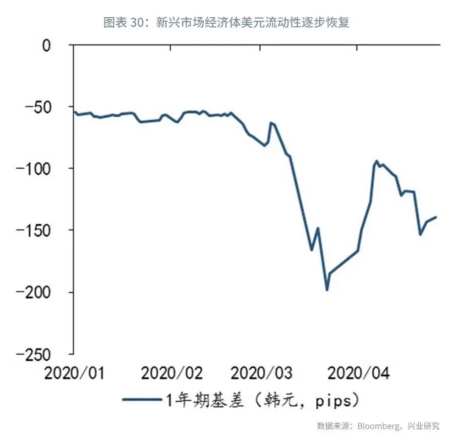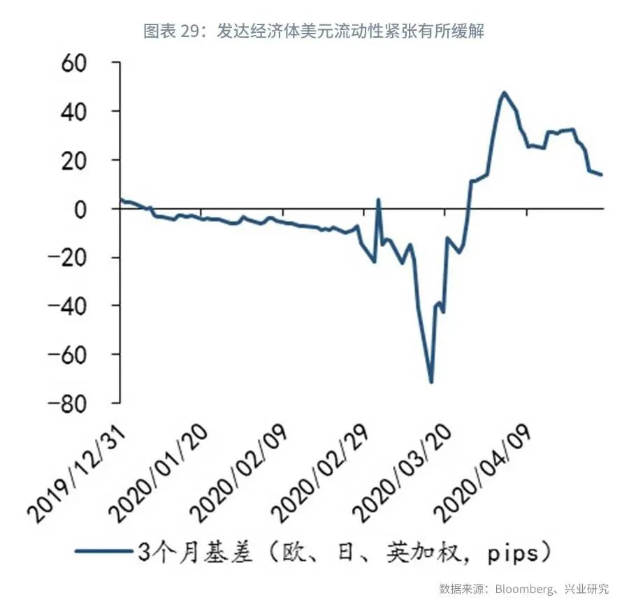 4月,全球美元流动性较3月均出现明显好转(见图表27至图表30)。美联储继续加码宽松,包括继续扩大回购操作支持力度,推出新型工具支持市政债和中小企业等,降低此前信用债购买工具的评级标准等,叠加市场波动率下降,风险偏好回升,其中回购市场和非美发达经济体的掉期市场美元相对充裕,商业票据市场和新兴市场货币掉期市场仍处于逐步恢复的阶段。