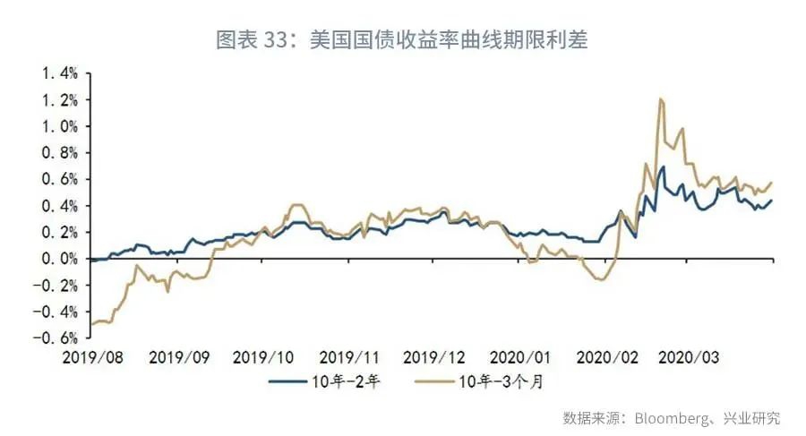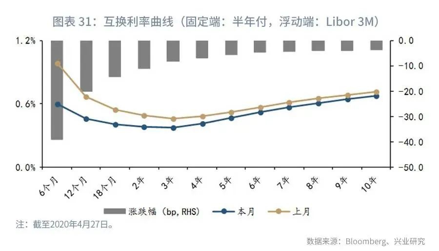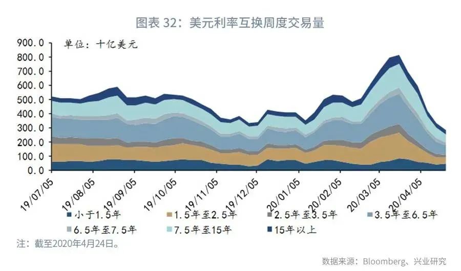 4月,市场紊乱逐渐平息,美债市场恢复正常,长端美债收益率中枢相较3月出现下移,不过流动性环境改善更加明显带动短端国债收益率下行,美债期限利差并未出现明显回落(见图表33)。除此之外,美联储的流动性支持政策降低了交易商的压力,叠加互换需求下降,互换利差(互换利率-减去相应期限的国债收益率)在3月大幅降低后,4月明显反弹逐步恢复正常。受以上因素影响,互换曲线短端价格下跌更明显,曲线倒挂程度有所缓解(见图表31)。交易量方面,利率互换交易量继续萎缩,当前美元流动性充裕,利率波动显著下降是重要诱因,不过预计5月该交易量会有所回升(见图表32)。