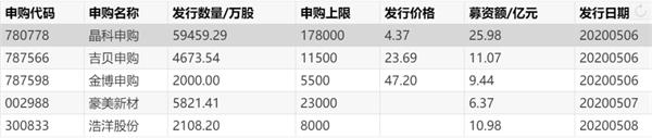 此外,数据统计显示,下周(4月30日至5月8日)将有5只新股发行,其中沪市主板有1只,中小板有1只,创业板有1只。5月 6日发行的是金博股份、吉贝尔、晶科科技;5月 7日发行的是豪美新材;5月 8日发行的是浩洋股份。这5只新股累计发行数量共计约7.41亿股,预计募集资金金额共计63.85亿元。