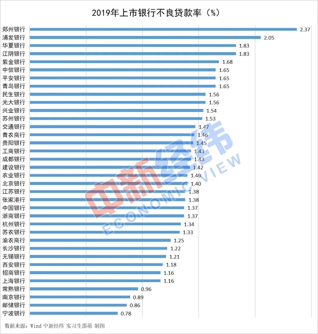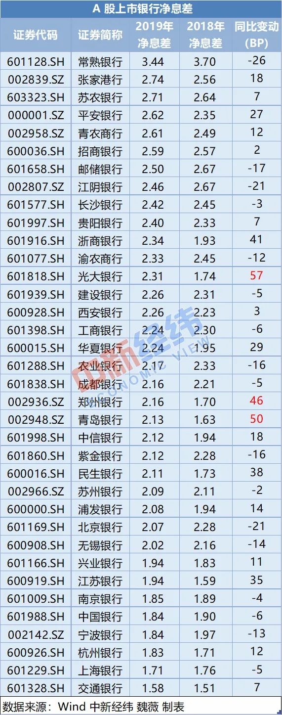同比来看,较2018年,城商行整体增速较快,收入增长约18.74%;国有银行增速最慢,同比增长7.89%,36家上市银行中,青岛银行的营收增速最快,达到30.44%,渝农商行的营收增速垫底,仅1.97%。