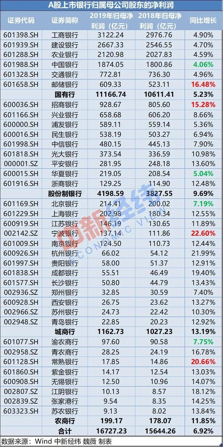 2019年,36家上市银行净利润增速均实现正增长,其中国有银行平均净利润增速为5.23%,邮储银行是唯一双位数增长的国有银行,中国银行的净利润增速仅4.06%,不仅在六大国有银行中增速最低,在36家上市银行中增速也垫底。