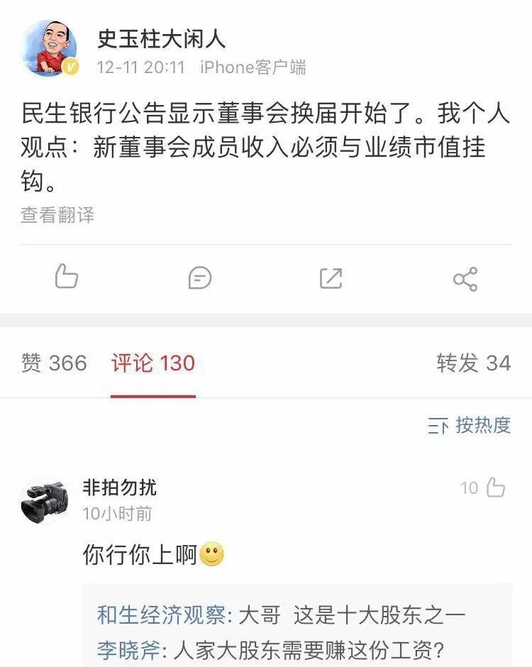 值得注意的是,民生银行即将进行新一轮董事会换届,作为该行非执行董事的史玉柱,于2019年12月在微博上喊话称,“新董事会成员收入必须与业绩市值挂钩。”