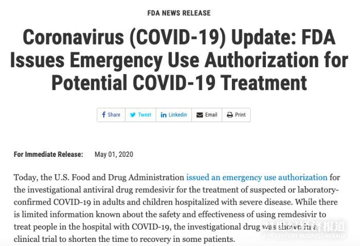 2020年5月1日,美国食品和药物管理局(FDA)对瑞德西韦的监管迈出了新一步。FDA发出紧急使用许可,用于研究性抗病毒药物瑞德西韦(remdesivir)在患有严重新冠肺炎(COVID-19)的成年人和儿童中治疗。