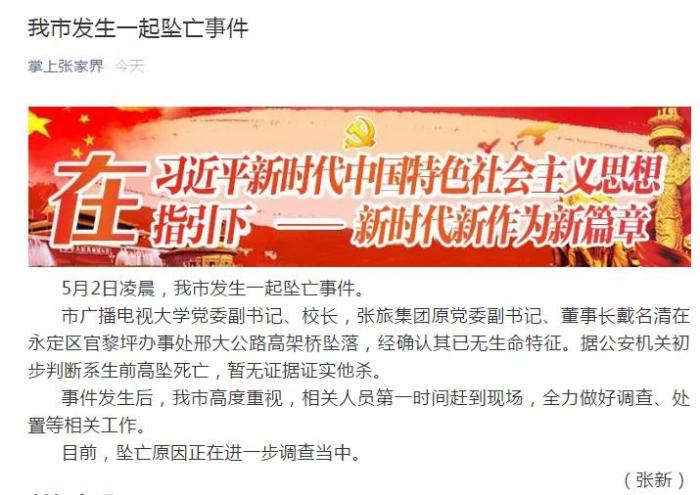 据通报,张家界市广播电视大学党委副书记、校长,张旅集团原党委副书记、董事长戴名清5月2日凌晨在永定区官黎坪办事处邢大公路高架桥坠落,经确认其已无生命特征。据公安机关初步判断系生前高坠死亡,暂无证据证实他杀。目前,坠亡原因正在进一步调查当中。