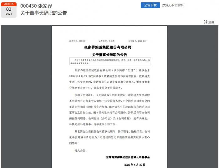 值得注意的是,在年报中,张家界披露,戴名清2019年从公司获得的税前报酬总额为43.17万元。5月2日下午,张家界发布公告称,4月29日,公司收到戴名清的书面辞职报告,戴名清因工作变动原因,申请辞去公司第十届董事会董事长、董事及董事会战略委员会主任、提名委员会委员等职务。戴名清未持有公司股份,辞职后将不在公司担任任何职务。