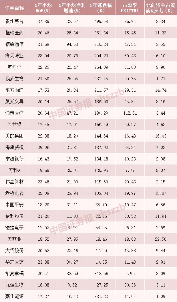 这25家上市公司,近5年平均ROE的平均值为21.46%,近5年平均净利增速的平均值为26.02%。值得一提的是,这25股都被北向资金持有,占流通A股比的平均值为7.13%。