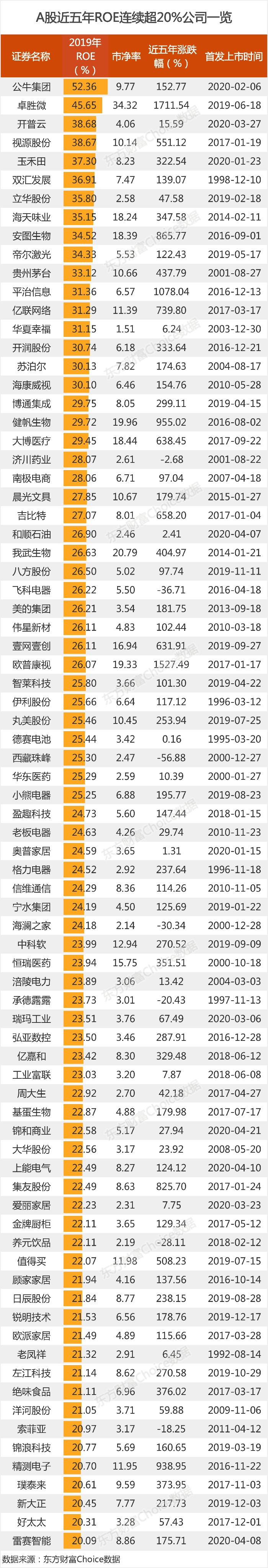 如果是近五年来ROE连续高于20%的公司个股则有79只,其中包括美的集团、海康威视、海天味业、洋河股份、贵州茅台、恒瑞医药、格力电器等行业大白马。