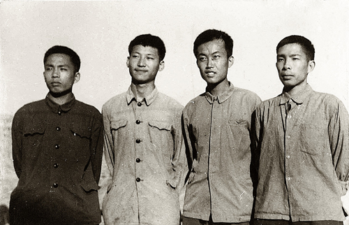 1973年,习近平和延川县北京知青雷平生(左一)、陶海粟(右二)、雷榕生(右一)在县城“三间房”前合影。图片来源:新华社谷溪摄