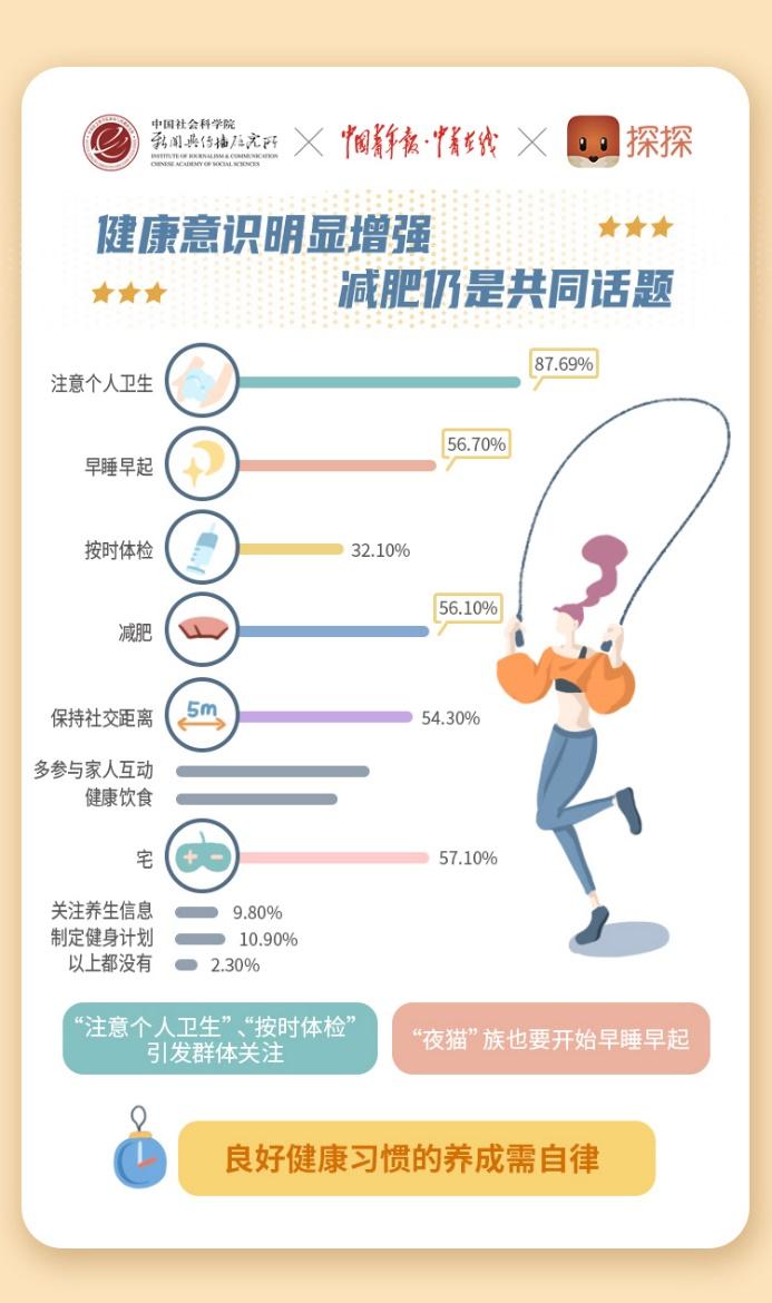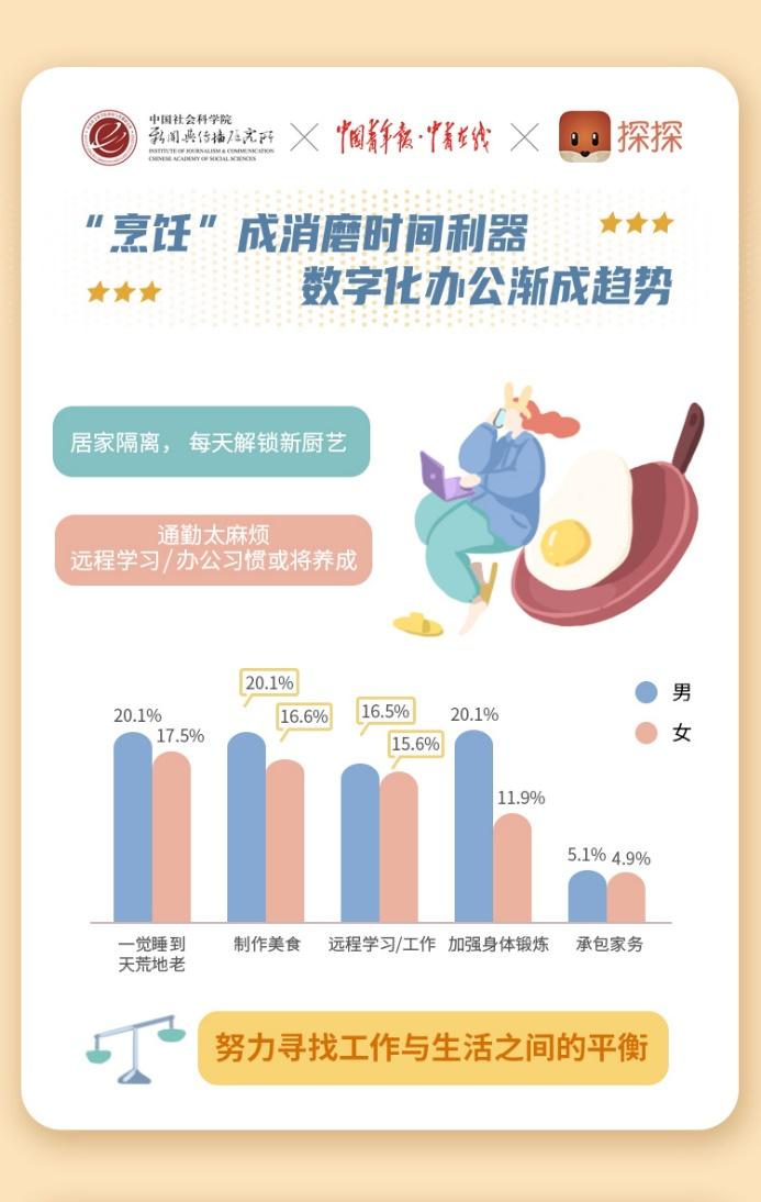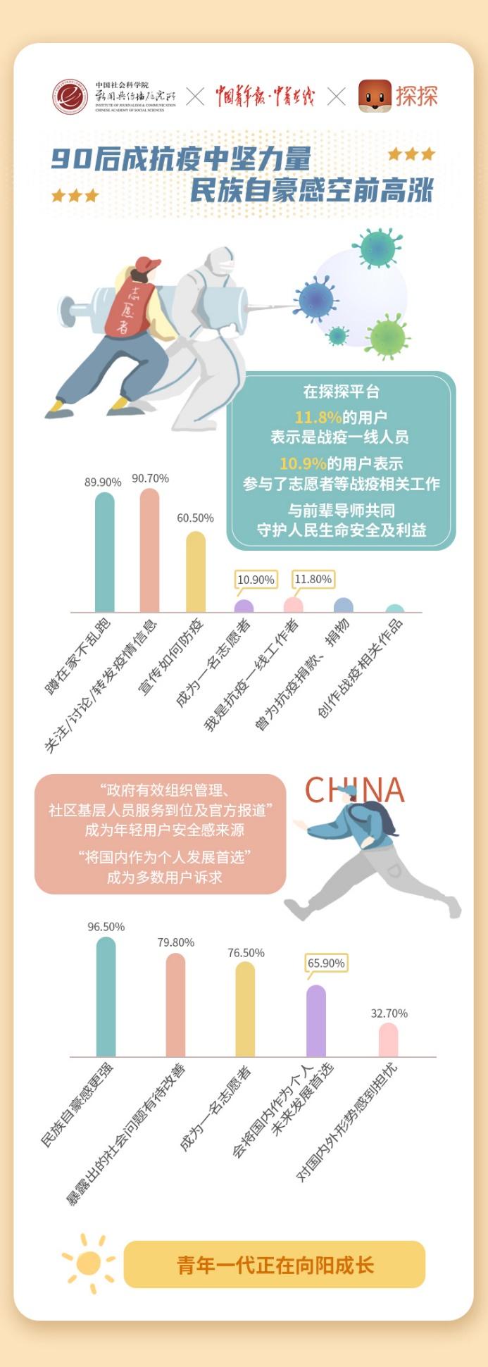 探探相关负责人安娜表示:“本次调研针对探探平台18至28岁用户发放问卷。数据显示:疫情期间,36.7%的年轻人习得烹饪美食的技艺,62.88%的人怀念往常的学习工作秩序,78.1%的用户选择保持有规律储蓄,而96.5%的人则激荡出强烈的民族自豪感。”