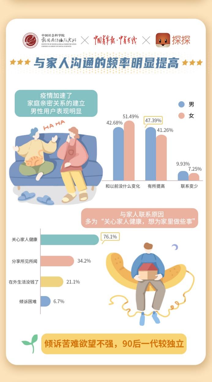 数据显示,疫情期间,四成以上的年轻人和家人沟通的频率所有提高,与家里联系最多的原因主要是“关心家人身体健康,想为家里做些事”,其次是“分享所见所闻”,而在沟通中选择“倾诉困难”的年轻人则少之又少。