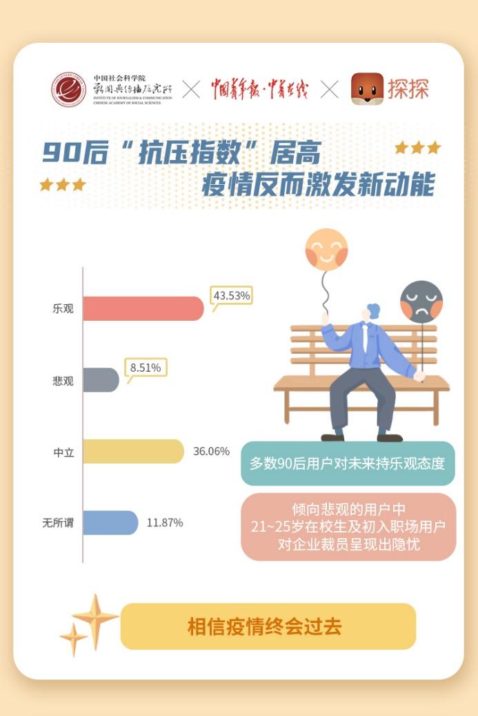 数据显示,43.53%的90后对未来持乐观态度,认为疫情反而激发了新动能。10.07%的21至25岁在校生及初入职场的年轻人,对企业裁员呈现出忧虑,而41.59%26至28岁的年轻人则相信疫情终会过去,其中有创业者身份的人心理承受能力相对更强。